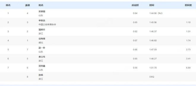 据现代快报报道,11月12日晚,第十五届全运会游泳比赛继续在深圳大运中心游泳馆举行。在男子200米自由泳决赛中,张展硕斩获冠军,季新杰亚军,潘展乐季军。本场比赛,孙杨的成绩位列第八,显示DSQ(被取消比赛资格)。