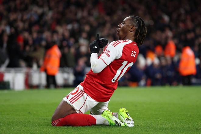 英超第12轮,阿森纳主场4-1大胜托特纳姆热刺,埃泽上演职业生涯首次帽子戏法,据统计,埃泽也成为自1978年12月阿兰·桑德兰之后,首位在北伦敦德比中上演帽子戏法的球员!