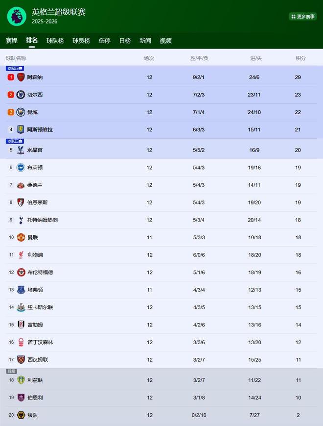 15场比赛13胜2平,阿森纳领跑英超积分榜